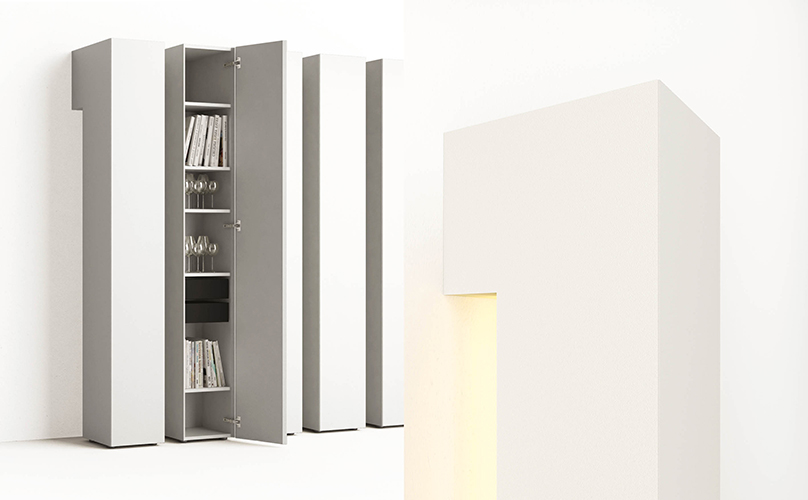 Un volume plastico dalle proporzioni eleganti. Un volume che prende forma. Si stacca dalla parete e disegna lo spazio.  Formosa è un sistema di contenitori di diverse dimensioni e configurazioni per adattarsi a diverse funzioni e ambienti della casa.